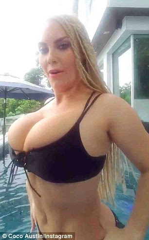 Coco Austin, teased her 13.8million fans with a video and photos of her huge boobs in corseted bikini few hours back, as she had some fun by the poolside.